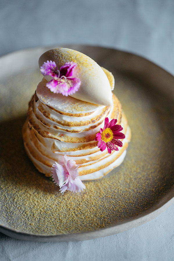 Blood peach compote, pistachio mousse, torched Italian meringue, crème fraîche ice-cream
