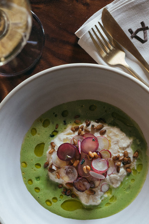 Cucumber, dill & yoghurt gazpacho, candied pine nuts, pickled grapes